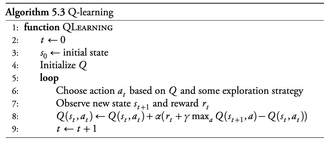 \(\quad \quad Q(s,a) \gets Q(s,a) +\alpha \left[R + \gamma \max \limits_{a'} Q(s', a') - Q(s,a)\right]\)