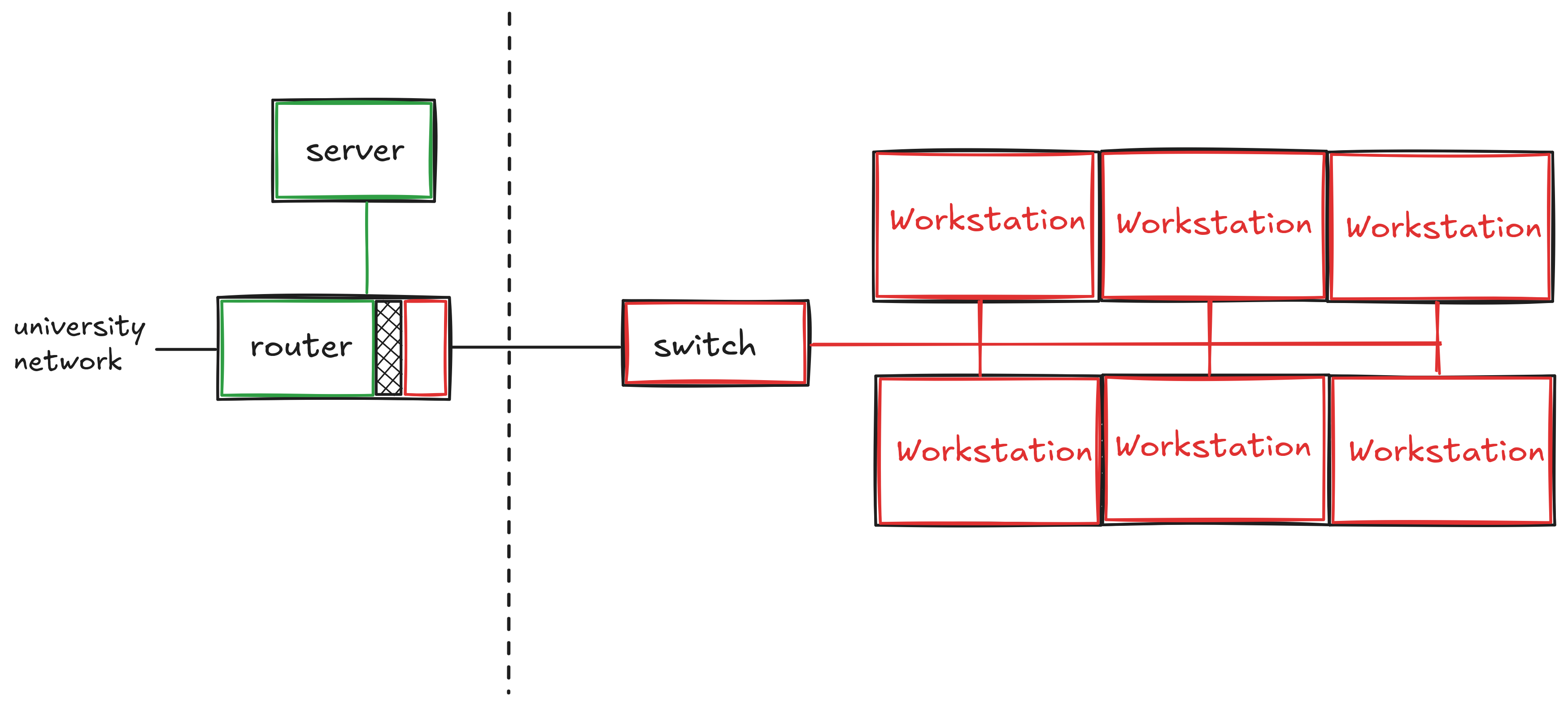 The lab consists of “air-gapped” workstations, each with compilers, editors, a terminal, and a web browser. These workstations are connected via switches to a router and server in a nearby server closet. The router and server partition the network for the workstations (shown in red below) from the general GW network, restricting access to most websites.